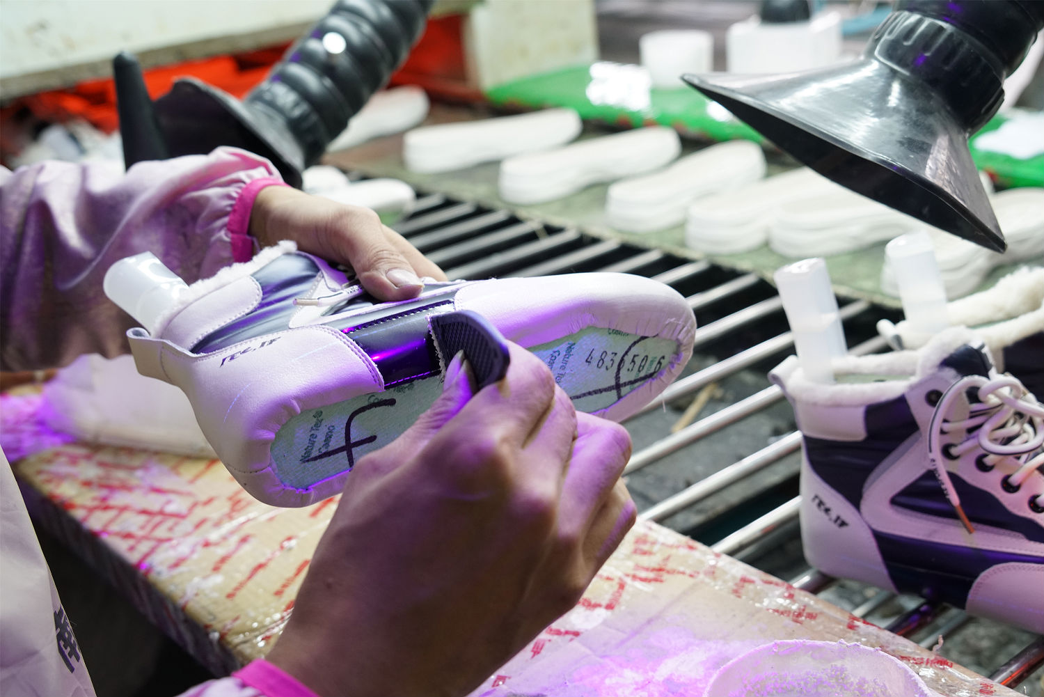 記者來到制鞋車間內(nèi),工人們正熱火朝天地忙碌著。記者在現(xiàn)場看到,在刷膠這道工序中,工人們都在一個(gè)集氣罩下進(jìn)行操作。